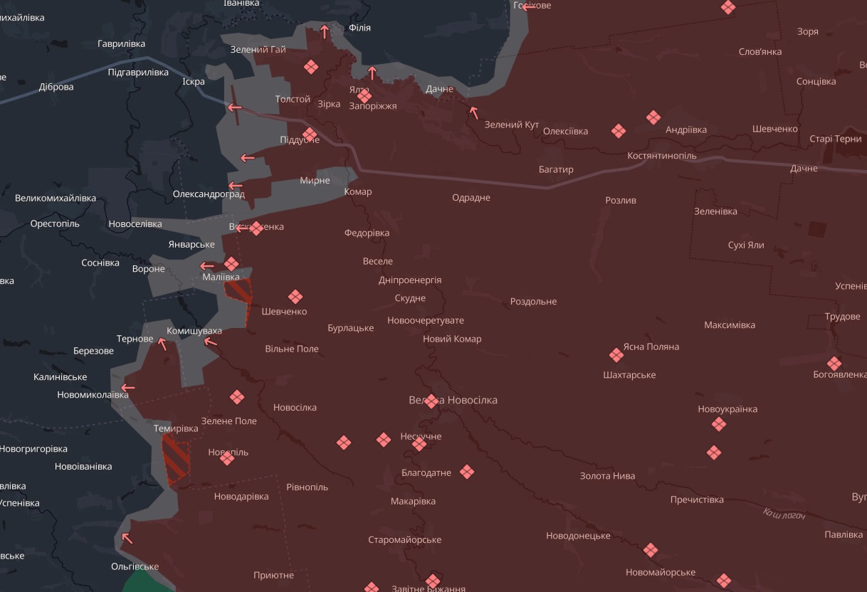 Йдеться про Звірове Донецької області, що фактично знаходиться на підступах до Покровська. Також зафіксовано зміни біля Темирівки у Запорізькій області. Це село розташоване у стратегічній зоні – на стику Запорізької, Донецької та Дніпропетровської областей, що робить його важливим для подальших дій обох сторін.