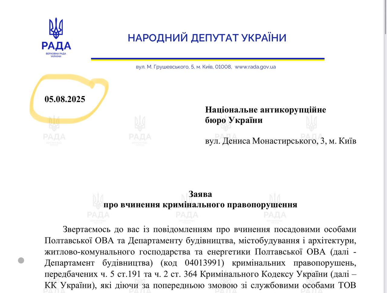 "НАБУ починає розслідування по результатах нашого сюжету щодо Проніна, Полтавської ОВА та зниклих 200 млн на фортифікаціях", – заявив депутат.