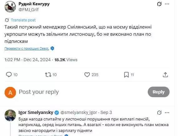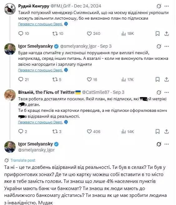 Скандал розгорівся після того, як у соцмережі X (колишній Twitter) з'явилися скриншоти розмови Смілянського з одним із користувачів, який звинуватив "Укрпошту" у звільненні листоноші через невиконання плану з підписок.