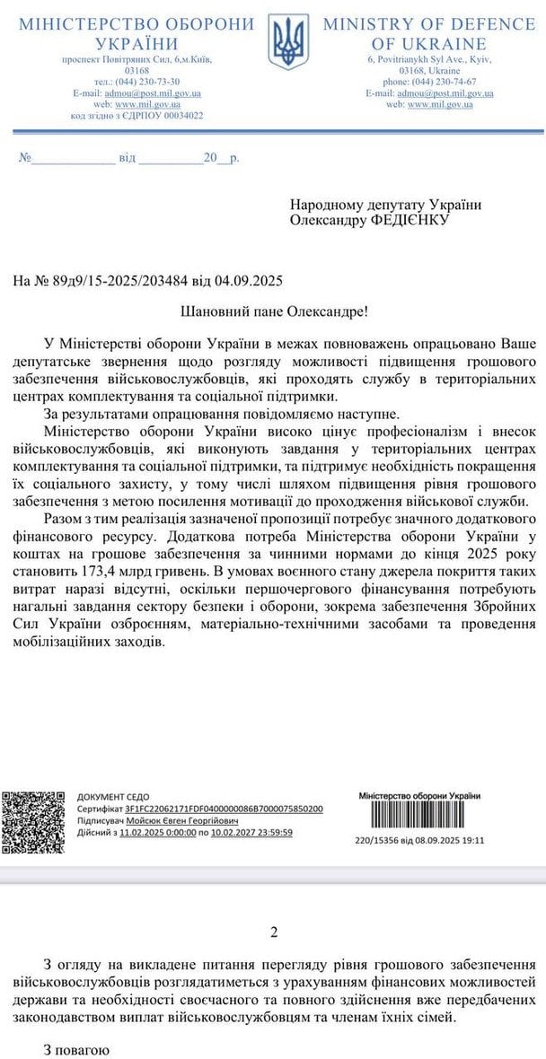 У відповідь у Міністерстві оборони повідомили, що наразі немає фінансування для таких підвищень. За їхніми словами, для цього у 2025 році потрібно додатково понад 173 млрд гривень, а всі ресурси нині спрямовуються на озброєння, техніку та мобілізацію.