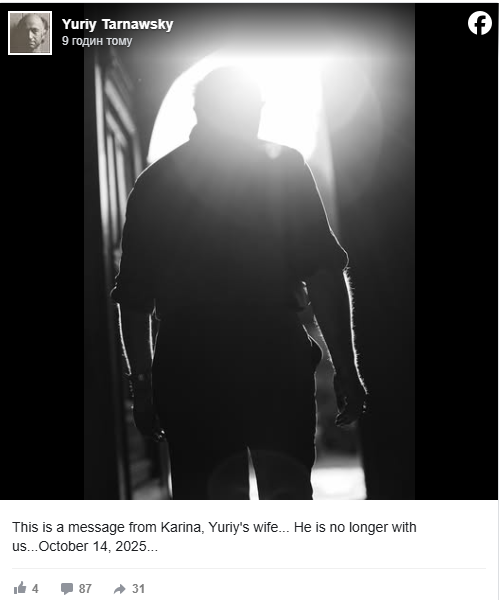 На сторінці письменника у Facebook з'явився допис, в якому зазначено: "Це повідомлення від дружини Юрія Карини… Його вже немає з нами… 14 жовтня 2025 року…"