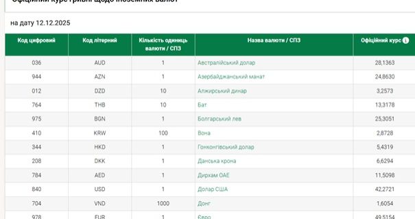 Схожа ситуація спостерігається й на ринку долара. Офіційний курс на 12 грудня встановлено на рівні 42,27 грн за одиницю. Порівняно з попереднім днем зміна незначна: 11 грудня долар коштував 42,28 грн. НБУ традиційно уточнює, що розрахункові показники вступають у силу з наступного календарного дня після їх оприлюднення.