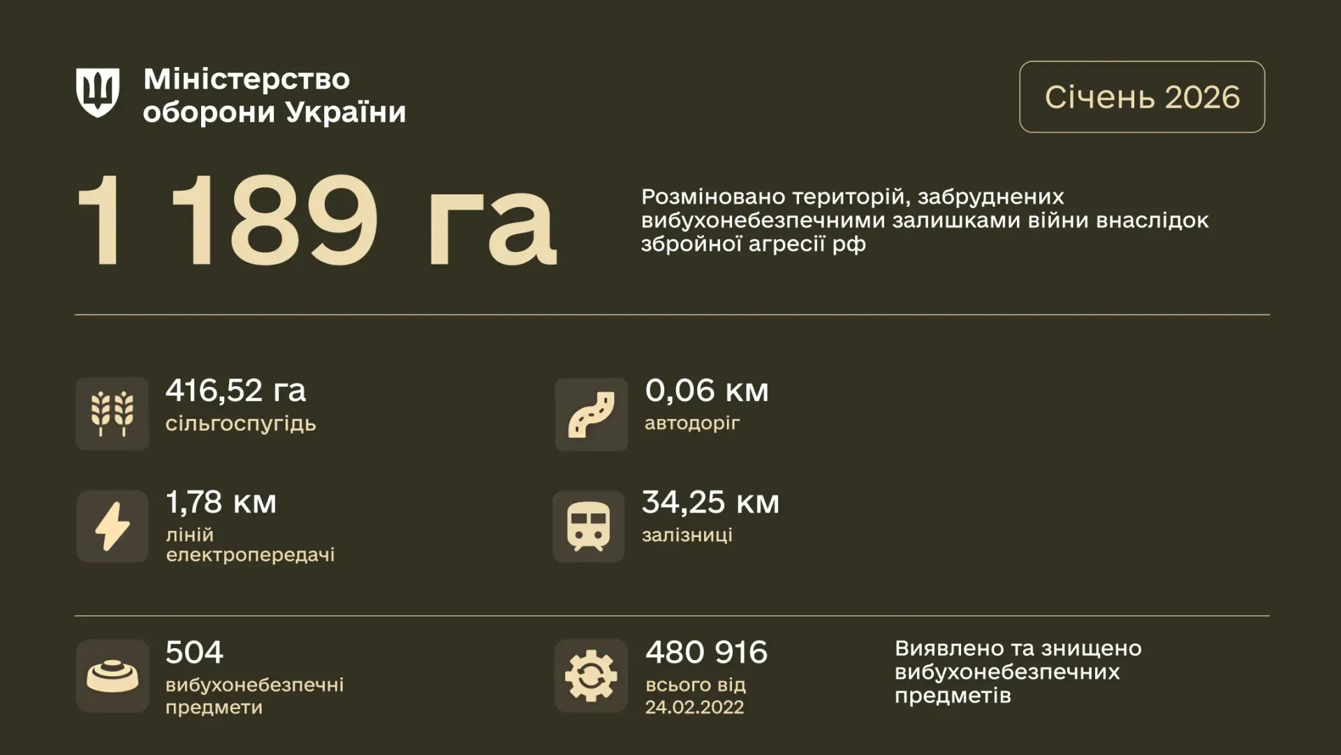 У січні 2026 року підрозділи Міністерства оборони розмінували 1 189 гектарів територій, звільнених від російських окупантів