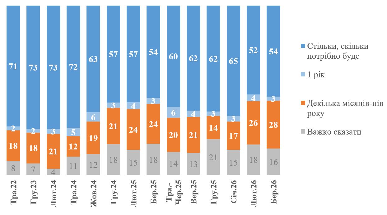 Упродовж останніх двох місяців в Україні знизилася частка громадян, готових терпіти війну стільки, скільки буде необхідно. Станом на початок березня таких 54%. Це 11% менше, ніж у січні