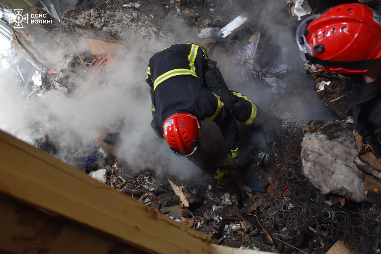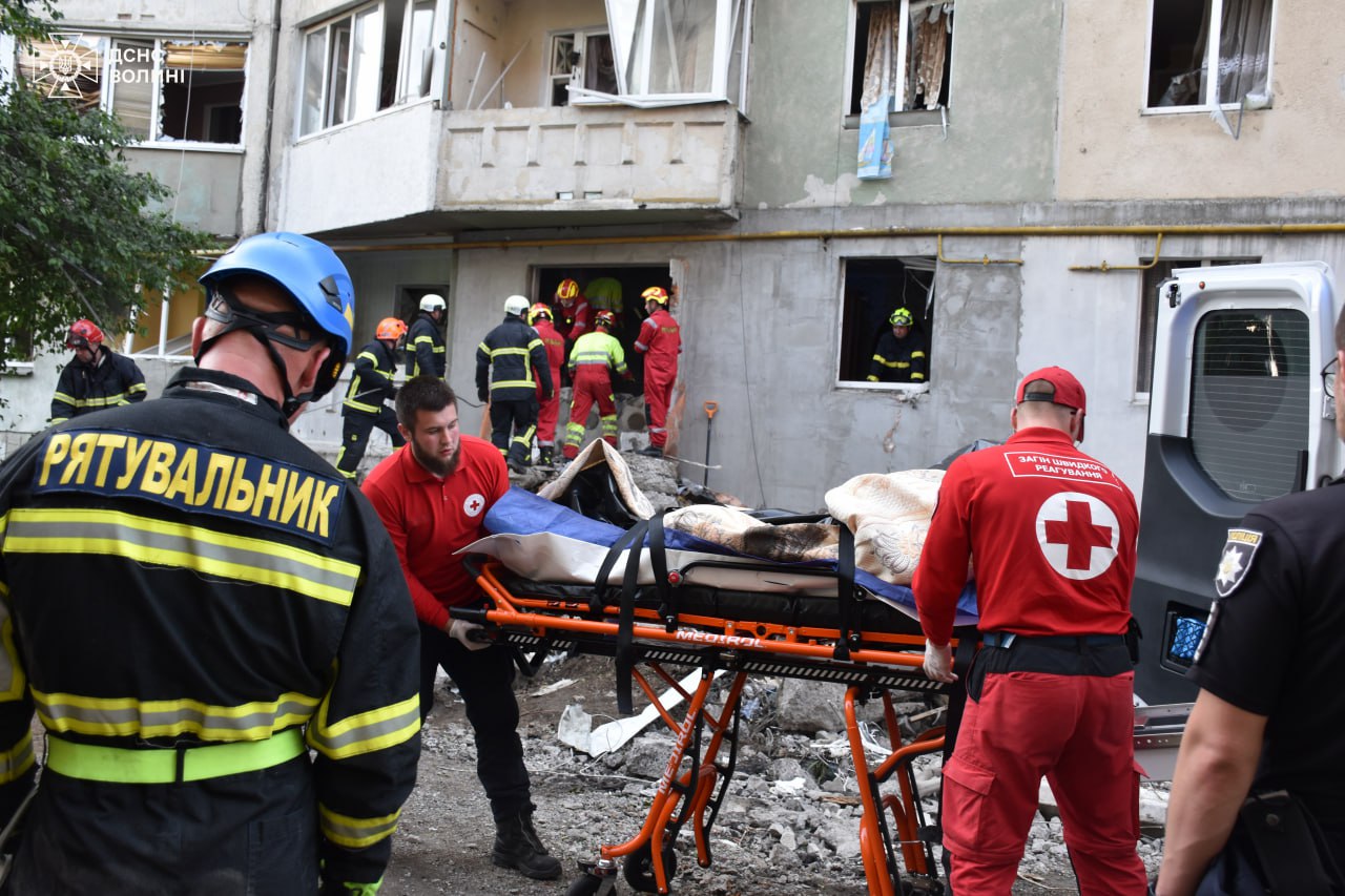 У Луцьку рятувальники деблокували з-під завалів зруйнованої дев'ятиповерхівки тіло загиблого 27-річного чоловіка. Кількість постраждалих зросла до 30. Рятувальники, волонтери Червоного Хреста, психологи ДСНС та всі необхідні служби продовжують працювати на місці ударів.