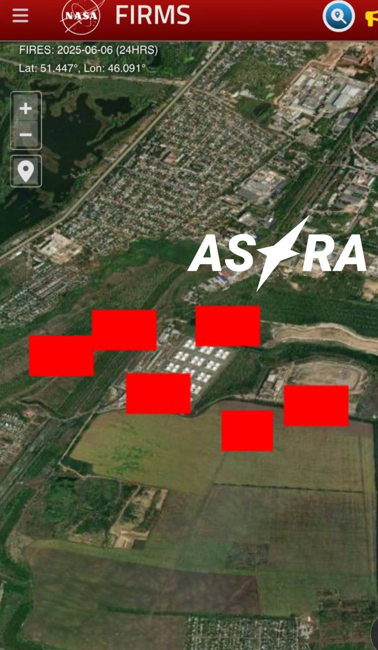 Губернатор Саратовської області повідомляв про "загоряння на одному з промислових підприємств". При цьому за даними з супутників NASA, як повідомив телеграм канал Astra, пожежу зафіксували на нафтобазі "Комбінат Кристал".