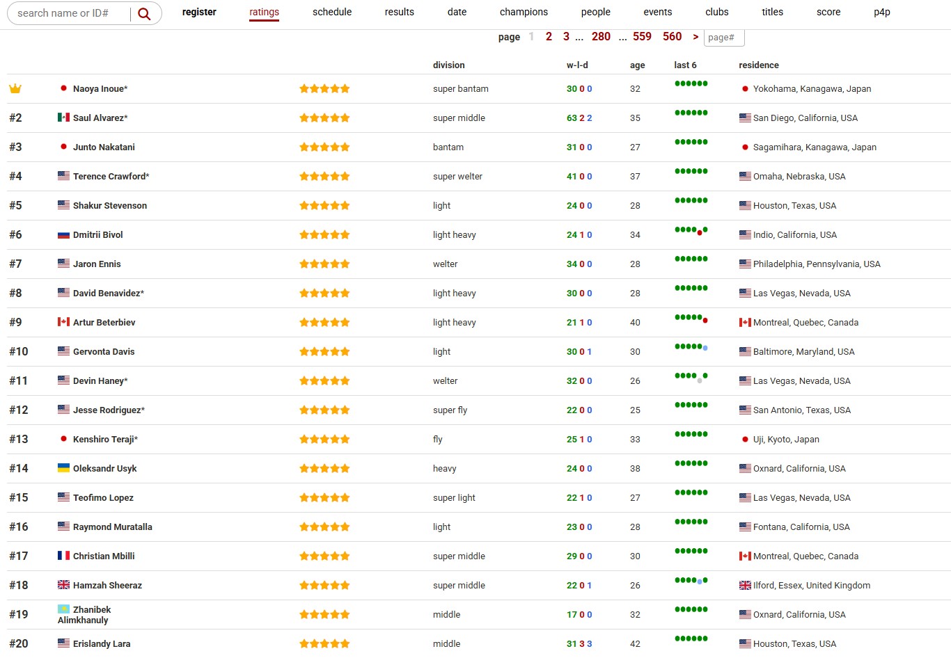Так, лідером рейтингу P4P BoxRec є абсолютний чемпіон світу у другій найлегшій вазі японець Наоя Іноуе.