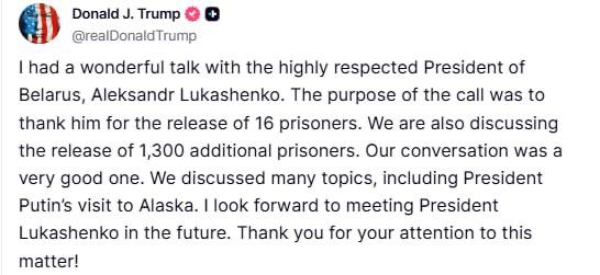 "Ми обговорили багато тем, включаючи візит президента Путіна до Аляски. Я з нетерпінням чекаю на зустріч з президентом Лукашенком у майбутньому. Дякую за вашу увагу до цього питання", - пише Трамп.