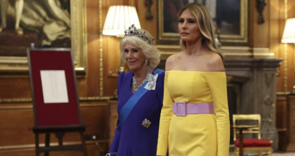 Представник Білого дому раніше повідомив CNN, що Меланія Трамп місяцями готувала свої образи для державного візиту, приділивши особливу увагу вечері у Віндзорському замку.