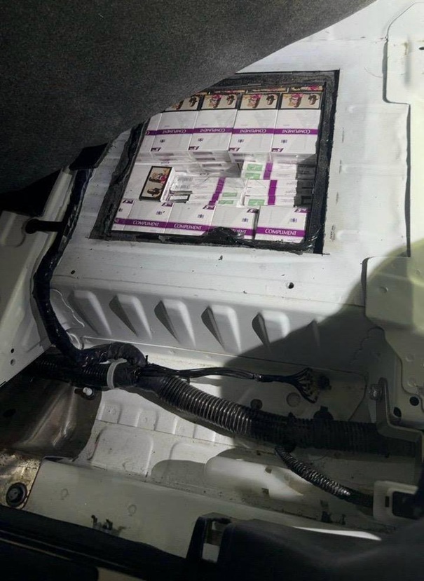 Під час поглибленого огляду транспортного засобу із залученням кінологічної служби митники виявили спеціально обладнаний тайник у підлозі авто. Після демонтажу передніх сидінь та обшивки підлоги з порожнин дістали 1764 пачки сигарет різних брендів, які не мали акцизних марок України.
