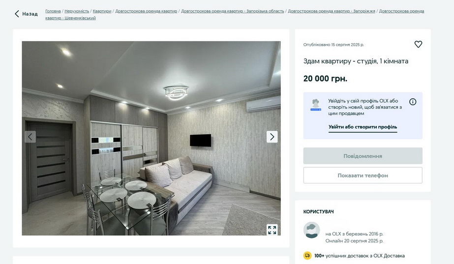 А що на OLX? Найдешевше, що тут пропонують, — це квартира в Заводському районі за 2 тисячі гривень на першому поверсі. Без ремонту, техніки, майже без меблів, за 500 метрів до найближчої зупинки.
